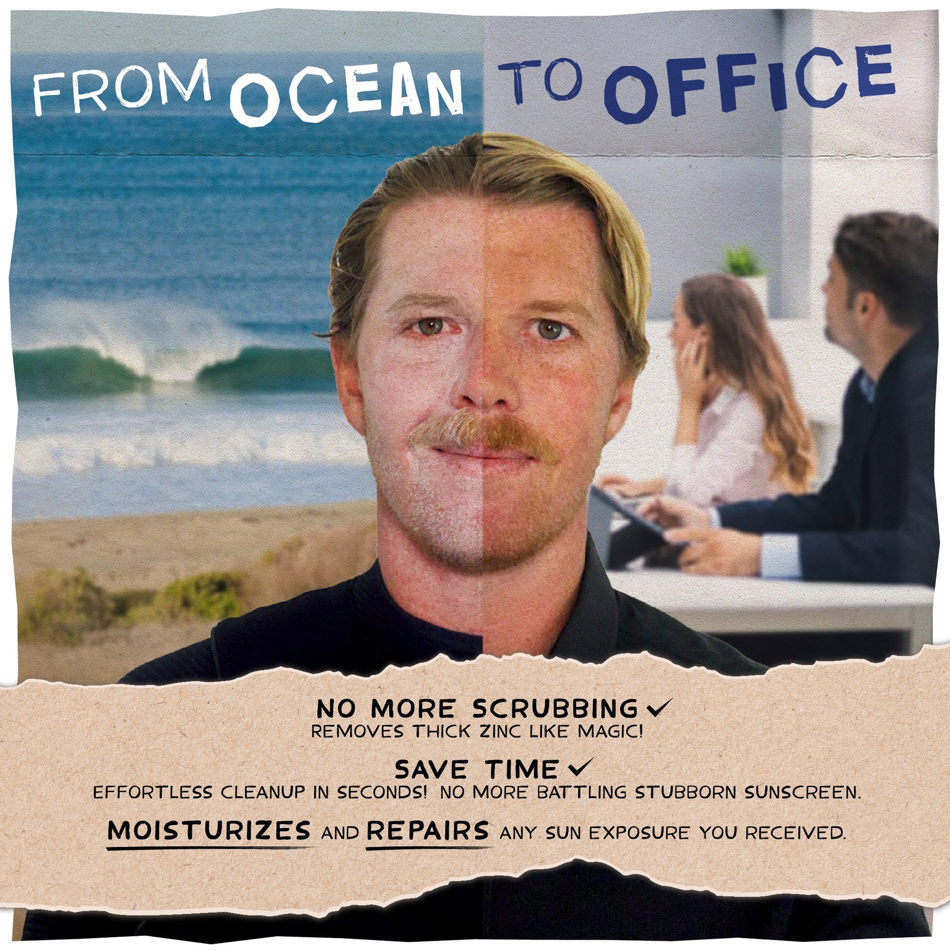Mineral sunscreen protects—but lingers. Kook-Off quickly eliminates stubborn white residue while replenishing skin with soothing, reef-safe ingredients so you look and feel your best.