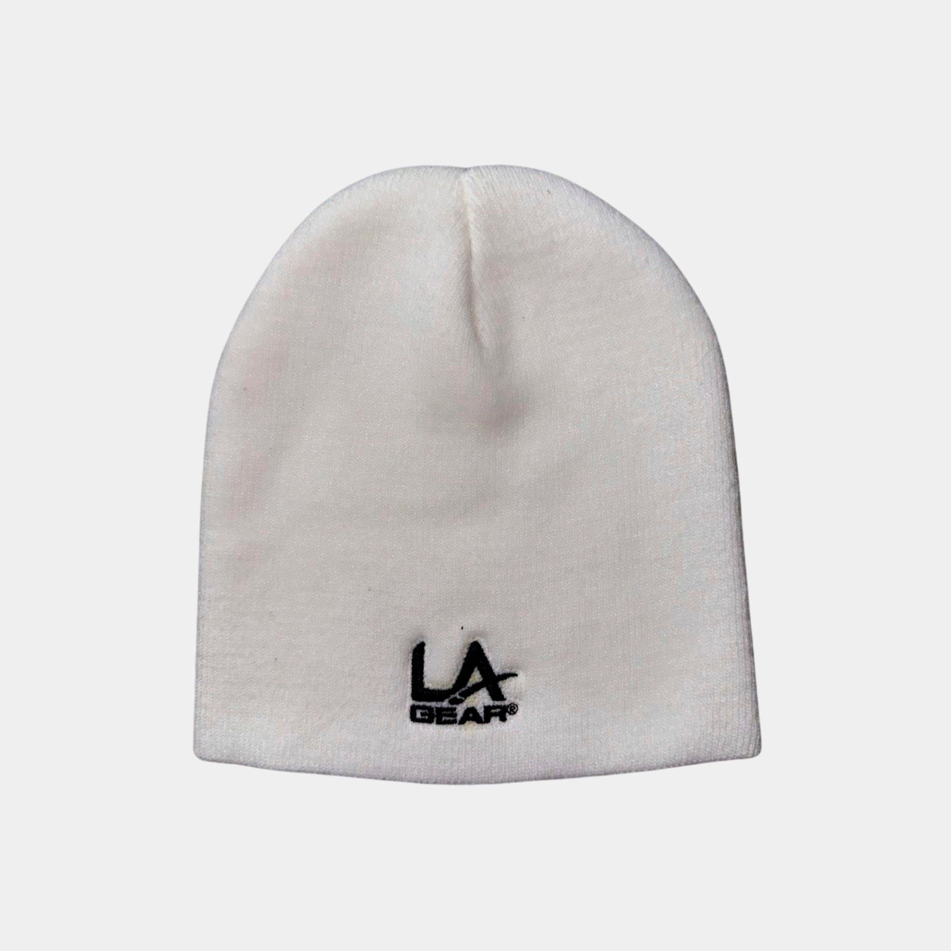 Classic knit beanie with an embroidered off-white LA Gear logo. One size fits most.