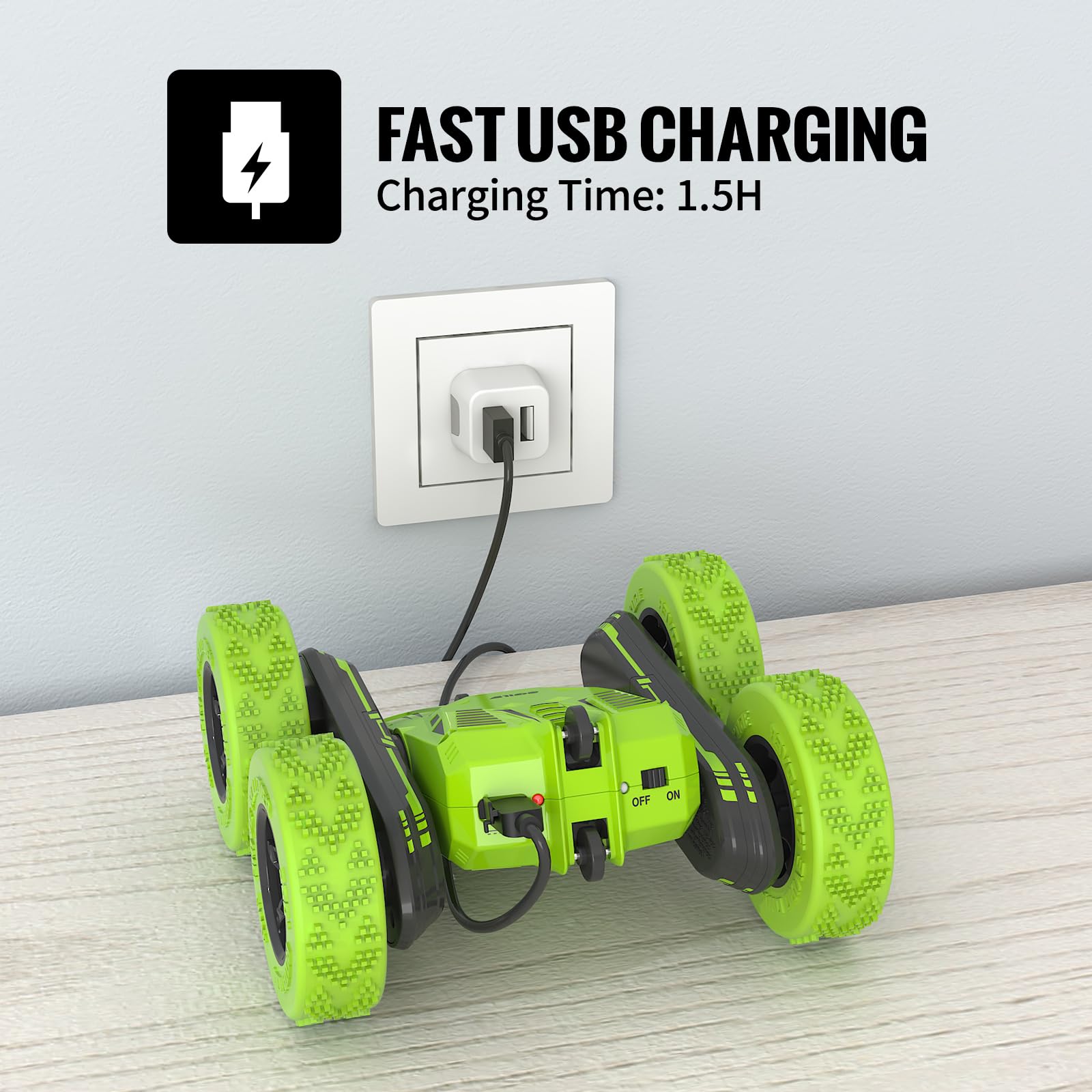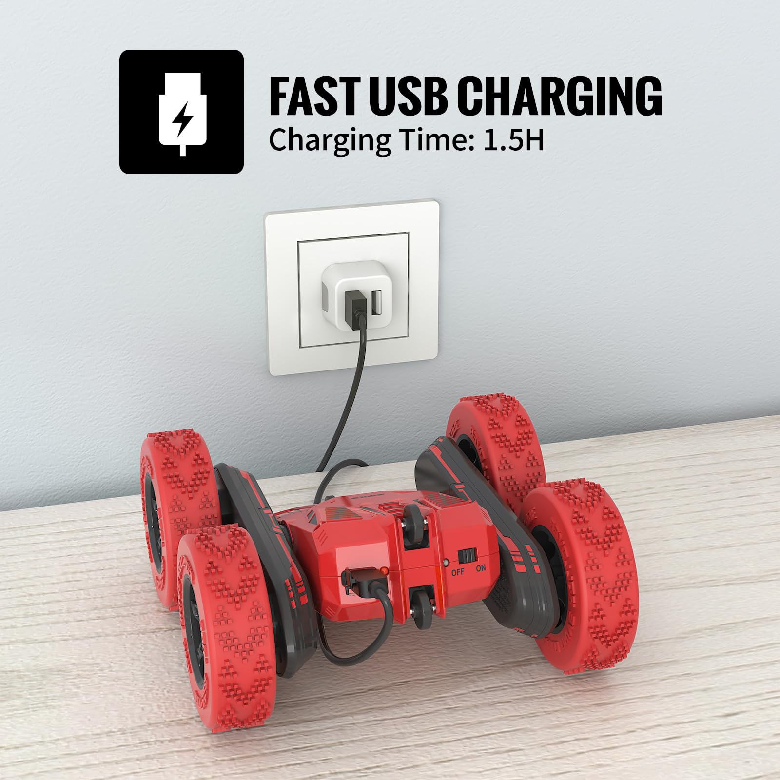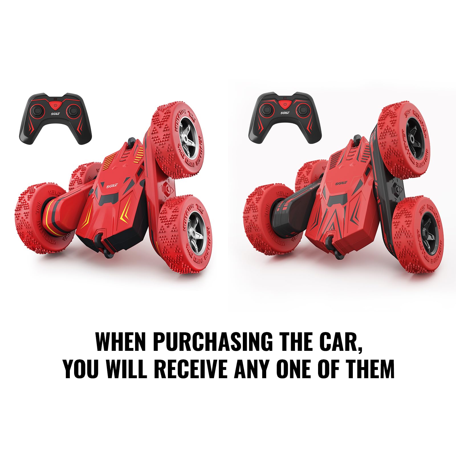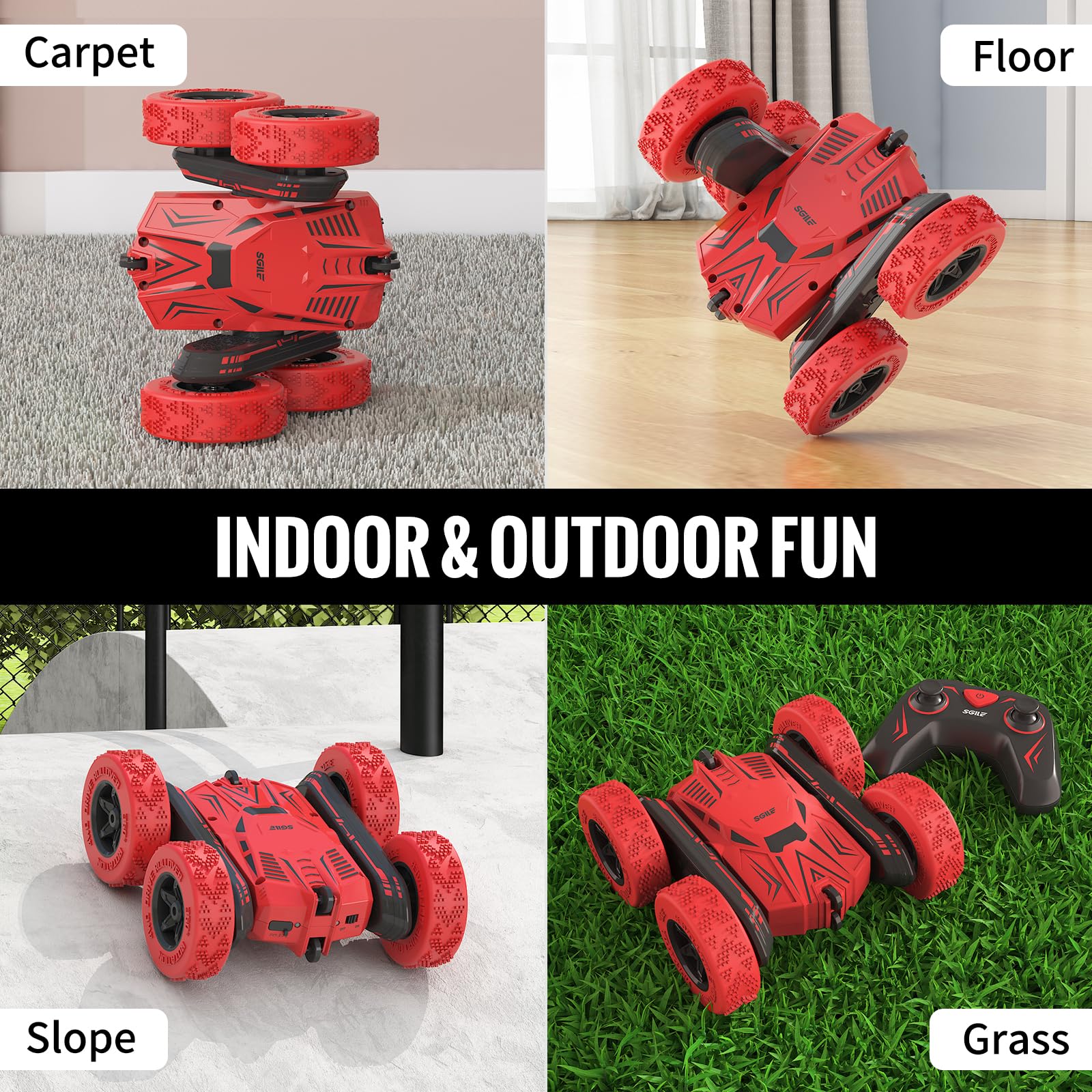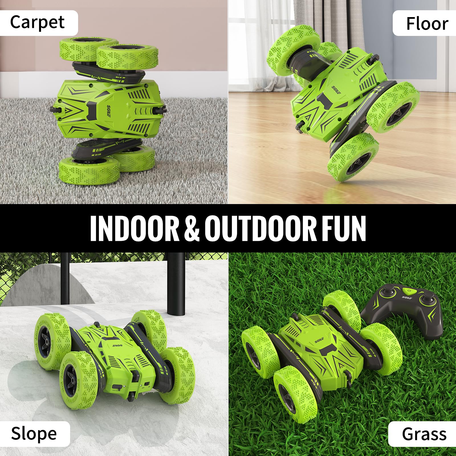 - Cool Stunts: Via remote control, the stunt car toy offers unlimited fun for you with 360 degree rotation, 180 degree double sided flips, moving forward, backward, turning left and right. This rc car provides multifaceted entertainment for kids girls boys age 6 7 8 12.